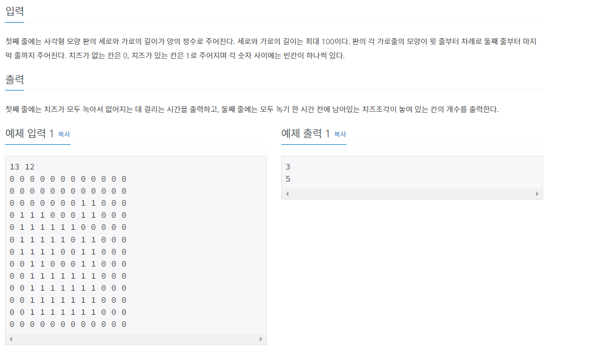 아래 <그림 1>과 같이 정사각형 칸들로 이루어진 사각형 모양의 판이 있고, 그 위에 얇은 치즈(회색으로 표시된 부분)가 놓여 있다. 판의 가장자리(<그림 1>에서 네모 칸에 X친 부분)에는 치즈가 놓