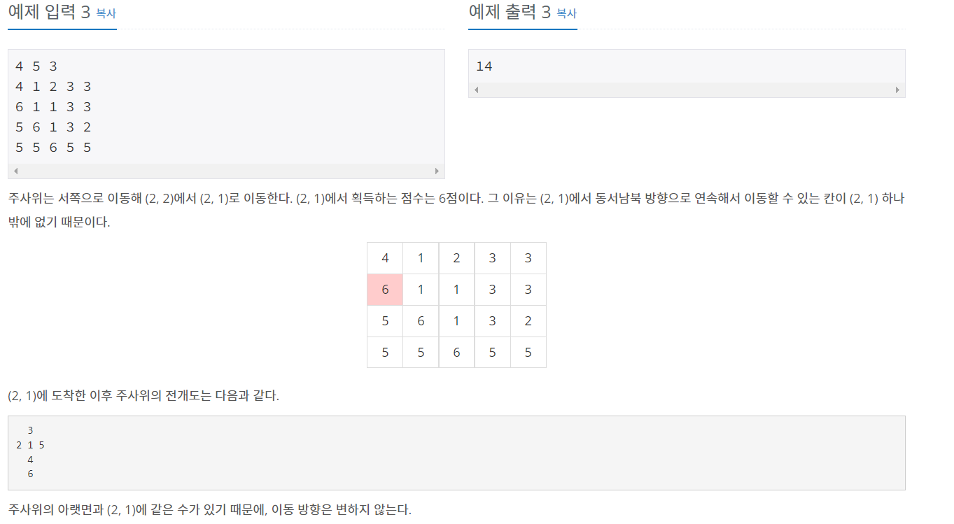 bfs는 그냥 같은 숫자를 세어주면 되었기 때문에 구현이 복잡하진 않았다. 문제는 주사위의 방향을 만들어주고, 이에 따라 주사위의 전개도를 바꿔주는 것이 좀 복잡했던 문제였다.